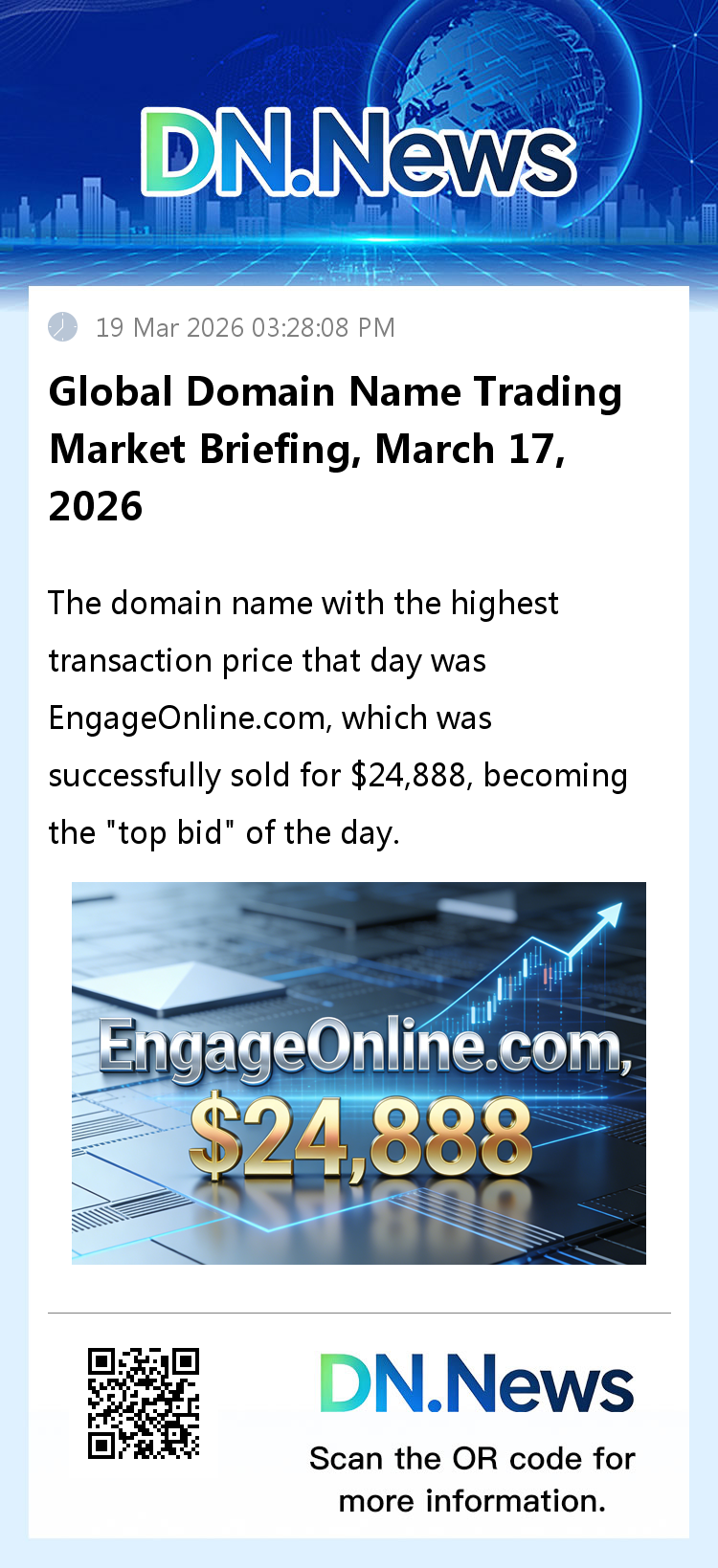 The highest-priced domain name sold that day was EngageOnline.com, which sold for $24,888, becoming the day's top seller. Looking at the transaction amounts, all domain name transactions exceeding $100 totaled $574,870. Statistics show that the average price per transaction for these mid-to-high-end domains was $906.74, demonstrating the stable value of mid-to-high-end domains.