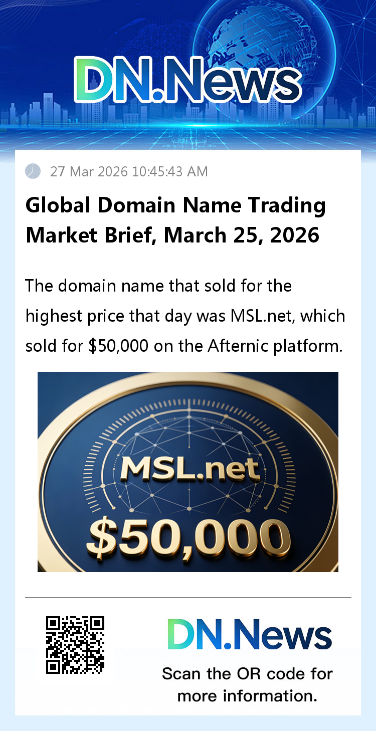 The highest-priced domain name sold that day was MSL.net, which sold for $50,000 on the Afternic platform. NameBio tracked 694 domain name transactions exceeding $100, totaling $636,537, with an average transaction price of $917.20. Compared to the previous day, the number of transactions increased by 9%, but the total transaction value decreased by 61%. NameBio also recorded another 1,949 domain name transactions below $100, totaling $29,879. Source: NameBio