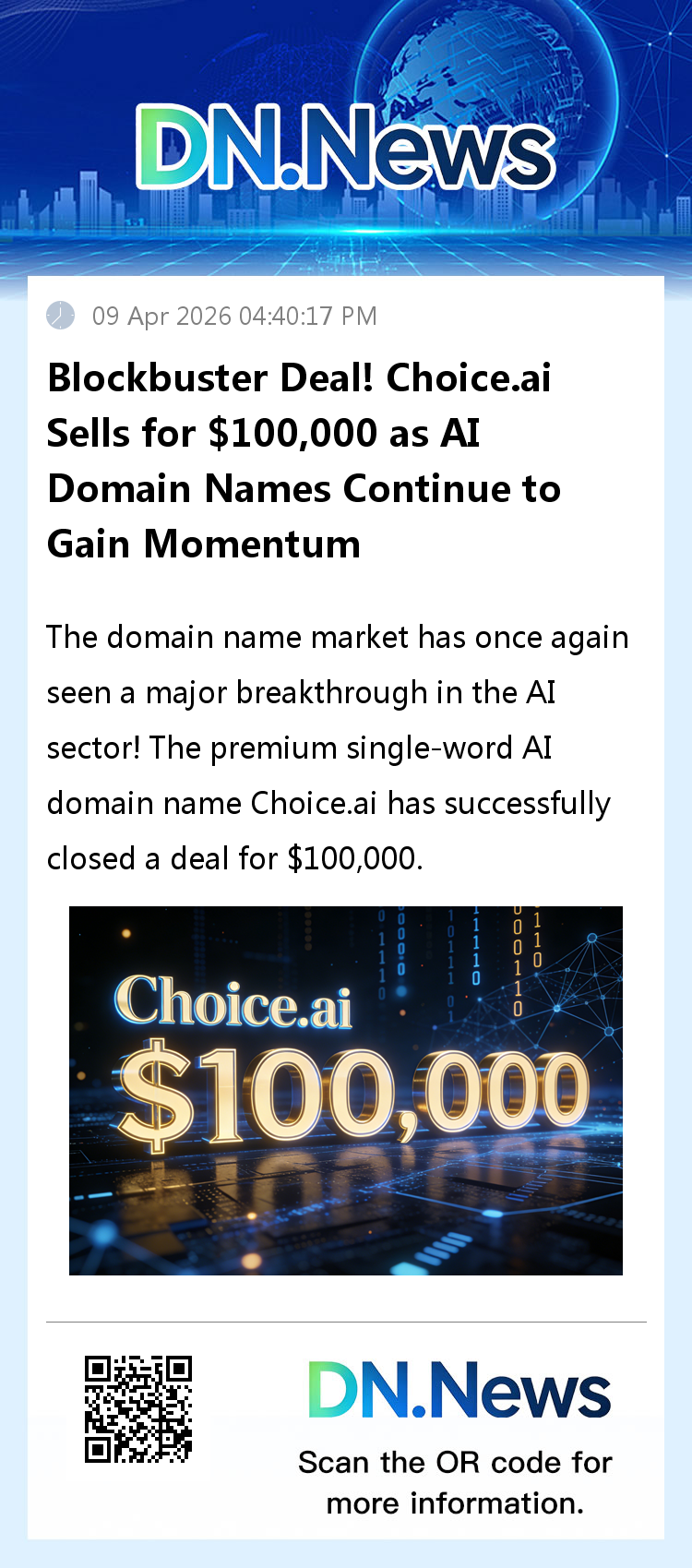 The domain name market has once again seen major news in the AI sector! The premium single-word AI domain name Choice.ai has successfully closed a deal for $100,000, firmly securing a spot at the top of the recent .ai domain sales rankings and establishing itself as another benchmark case in the AI domain name space.
