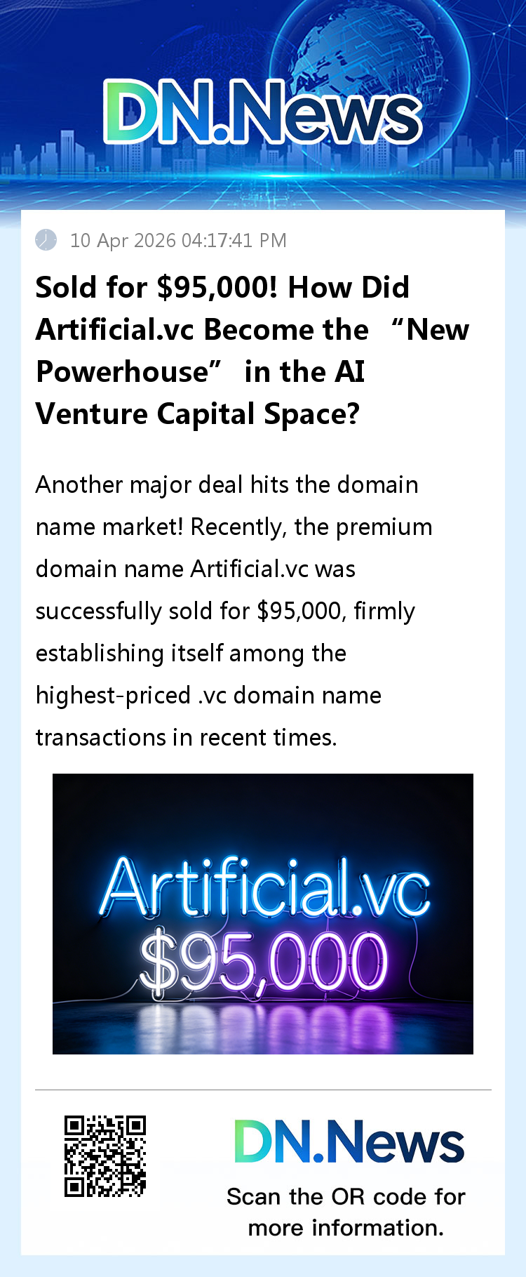 Another major deal has been made in the domain name market! Recently, the premium domain name Artificial.vc was successfully sold for $95,000, firmly establishing itself among the highest-value .vc domain name transactions in recent times and becoming the most closely watched digital asset transaction in the intersection of AI and venture capital. The sale of this domain not only highlights its dual core value but also reflects the explosive potential of niche-specific domain extensions in the context of the deep integration between the AI industry and the venture capital sector.