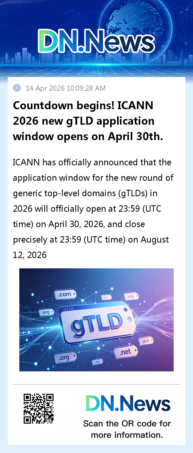 The global internet domain name industry is witnessing a historic moment – ICANN (Internet Corporation for Assigned Names and Numbers) has officially announced that the application window for a new round of generic top-level domains (gTLDs) in 2026 will officially open at 23:59 (UTC time) on April 30, 2026, and close precisely at 23:59 (UTC time) on August 12, 2026, for a total of 105 days. No new applications will be accepted after this period. This is the first systematic expansion of gTLD applications by ICANN in 14 years since its first large-scale opening of new gTLD applications in 2012.