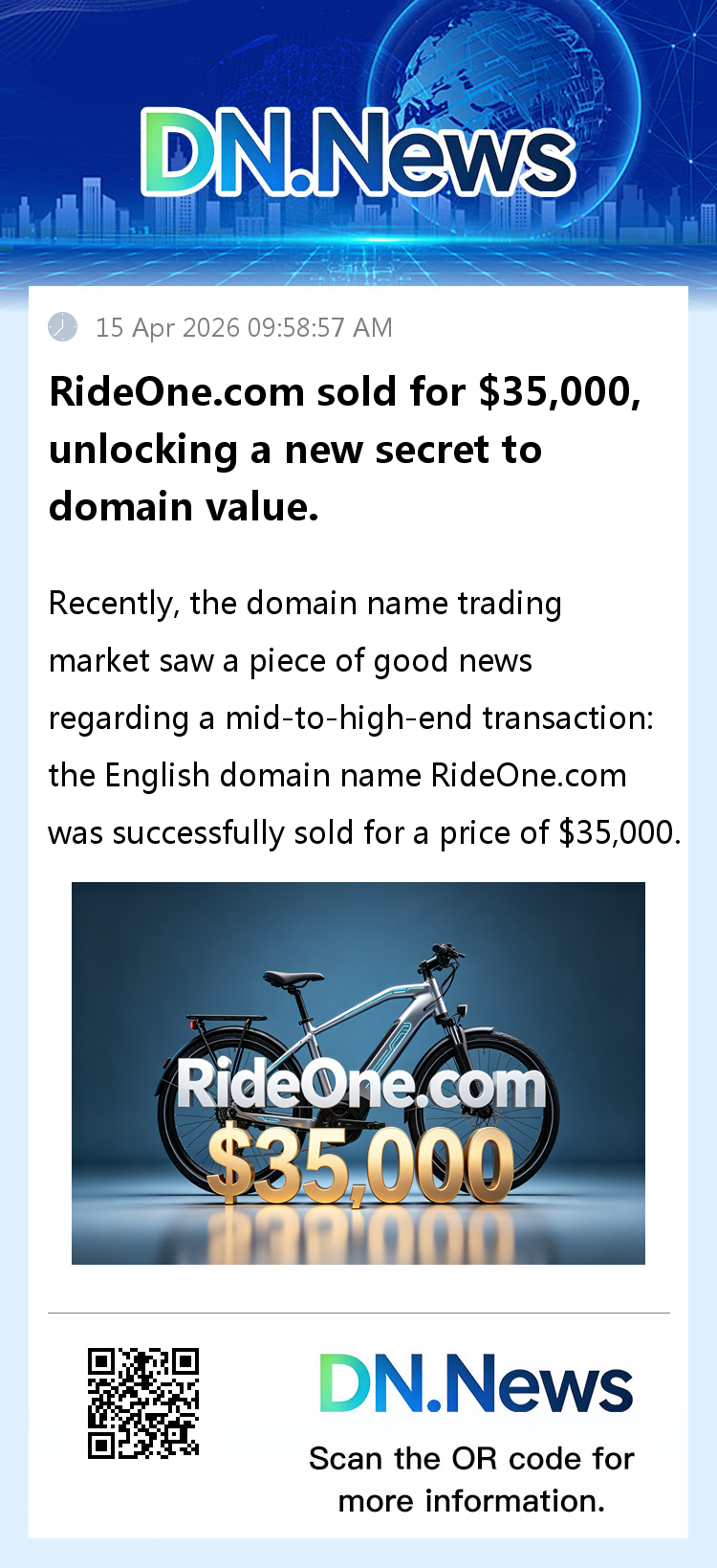 Recently, the domain name trading market saw a piece of good news regarding a mid-to-high-end transaction: the English domain name RideOne.com was successfully sold for $35,000, becoming the most popular domain name of the day and attracting widespread attention from the domain name investment community and the travel industry.